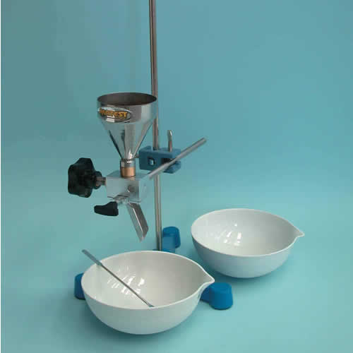 Filler feeding pan, complete with support base and clamp, nickel spatula, two round porcelain dishes.