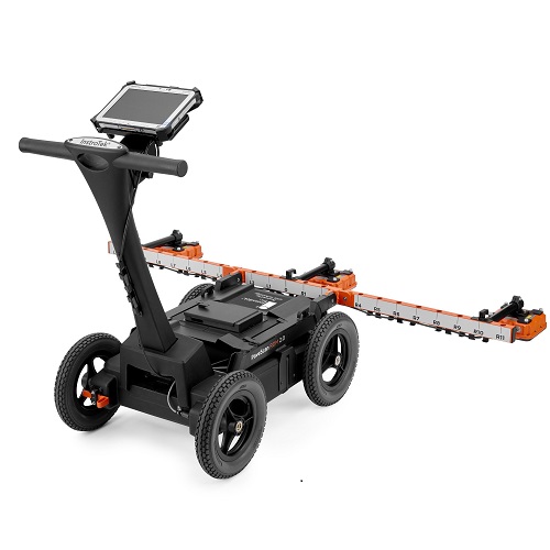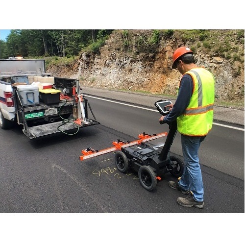 The InstroTek PaveScan Powered by GSSI Technology is the first non-nuclear rolling density system that provides real-time compaction and density data for the entire paving project. Proper compaction is the most important factor in producing long-lasting pavements. The PaveScan uses multiple sensors to continuously scan the entire pavement and provide a density profile of the entire paving project. The operator pushes the cart along the lane and gathers density data behind the asphalt rollers. The onboard computer displays density, compaction, a line graph, and a contour map of the measurements. This information is used by contractors and pavement engineers to assess the quality of the pavement.