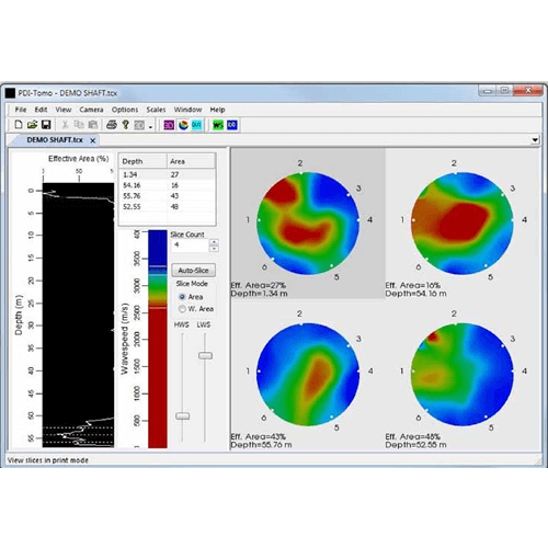 Tomography is a mathematical procedure that is applied to Crosshole Sonic Logging (CSL) data, providing the user with a visual image of a shaft’s internal defects. The procedure involves solving a system of equations based on First Arrival Times (FAT) in order to calculate wave speeds at various points within the shaft. Tomography wave speeds distributed throughout the shaft are directly proportional to density, indicating concrete quality. PDI-TOMO is an extension of the CHA-W software designed for superior tomographic results from CHAMP-XV data with increased efficiency for the user.