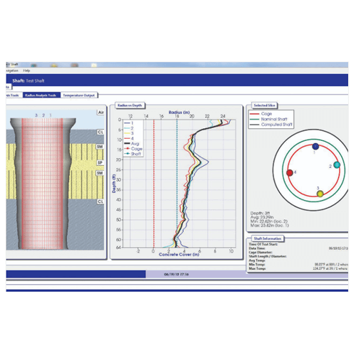 The TIP Probe Systemii includes a thermal probe with four orthogonal infrared sensors and a Thermal Acquisition Port for Probes (TAPP). Data is collected by inserting the probe in standard (40 to 50 mm) plastic or steel access tubes (TIP results are insensitive to tube de-bonding; access tubes must be empty of water during testing) previously built into the shaft. The probe is lowered into the tube (a depth measurement unit registers its location) and measures the internal temperature which is recorded by the TAPP. TIP Probe testing is typically performed within 12 to 48 hours of casting. TIP displays temperatures versus depth in real time during the test.
